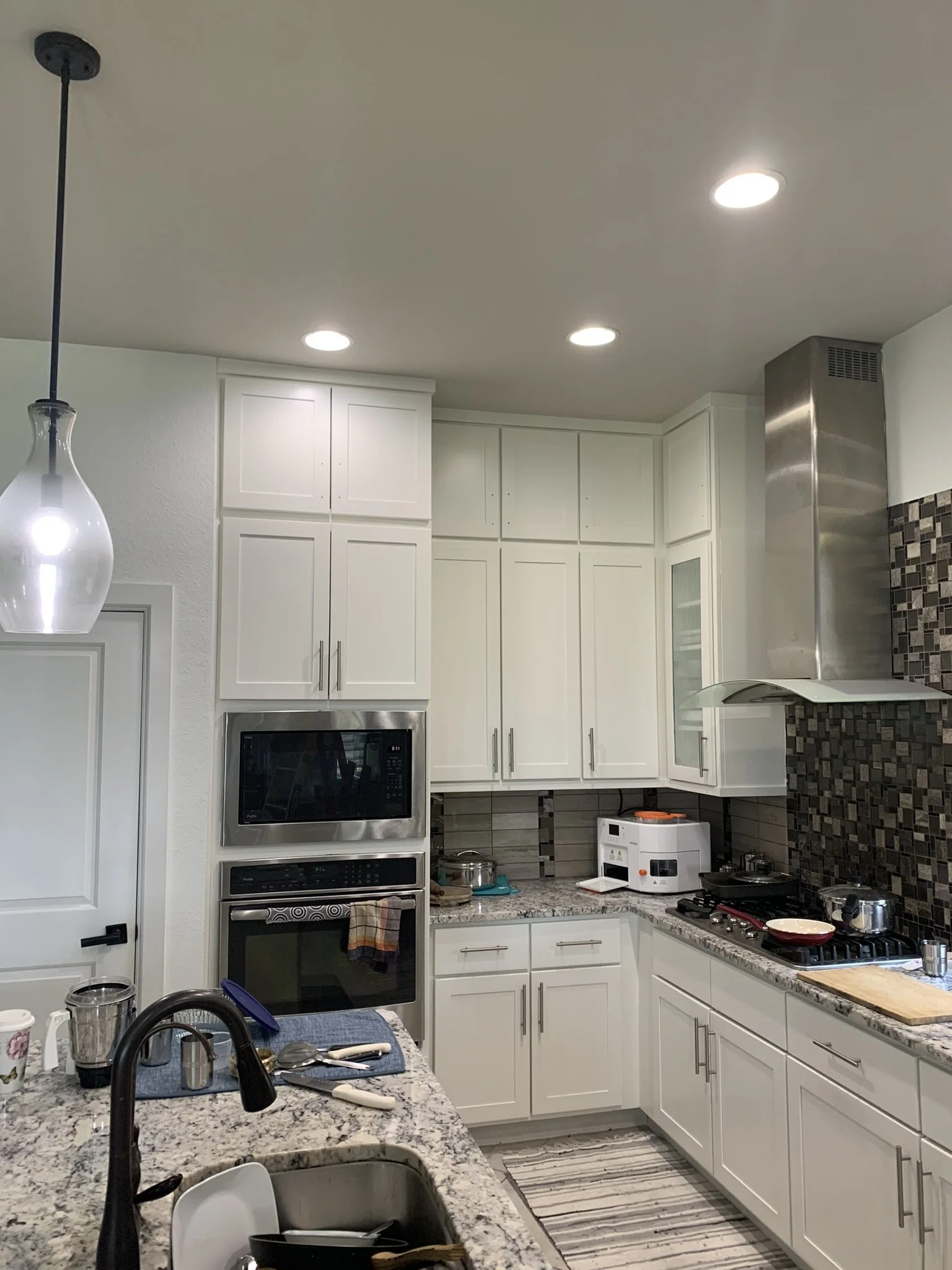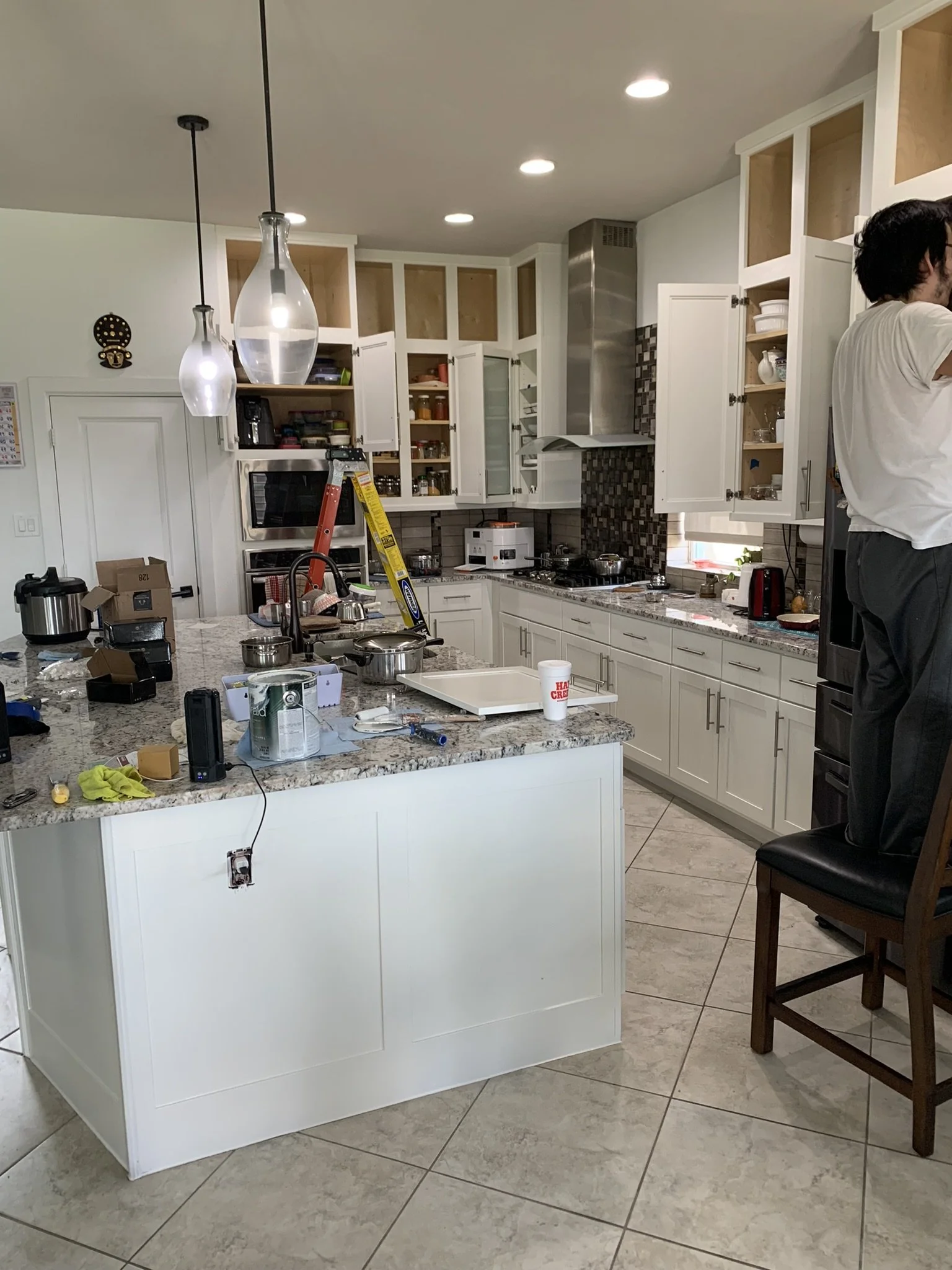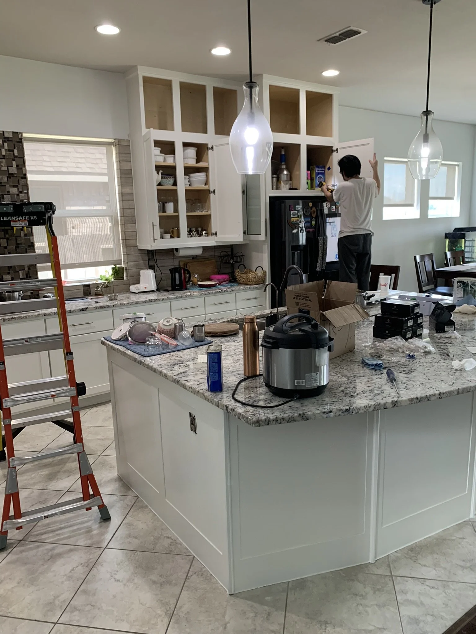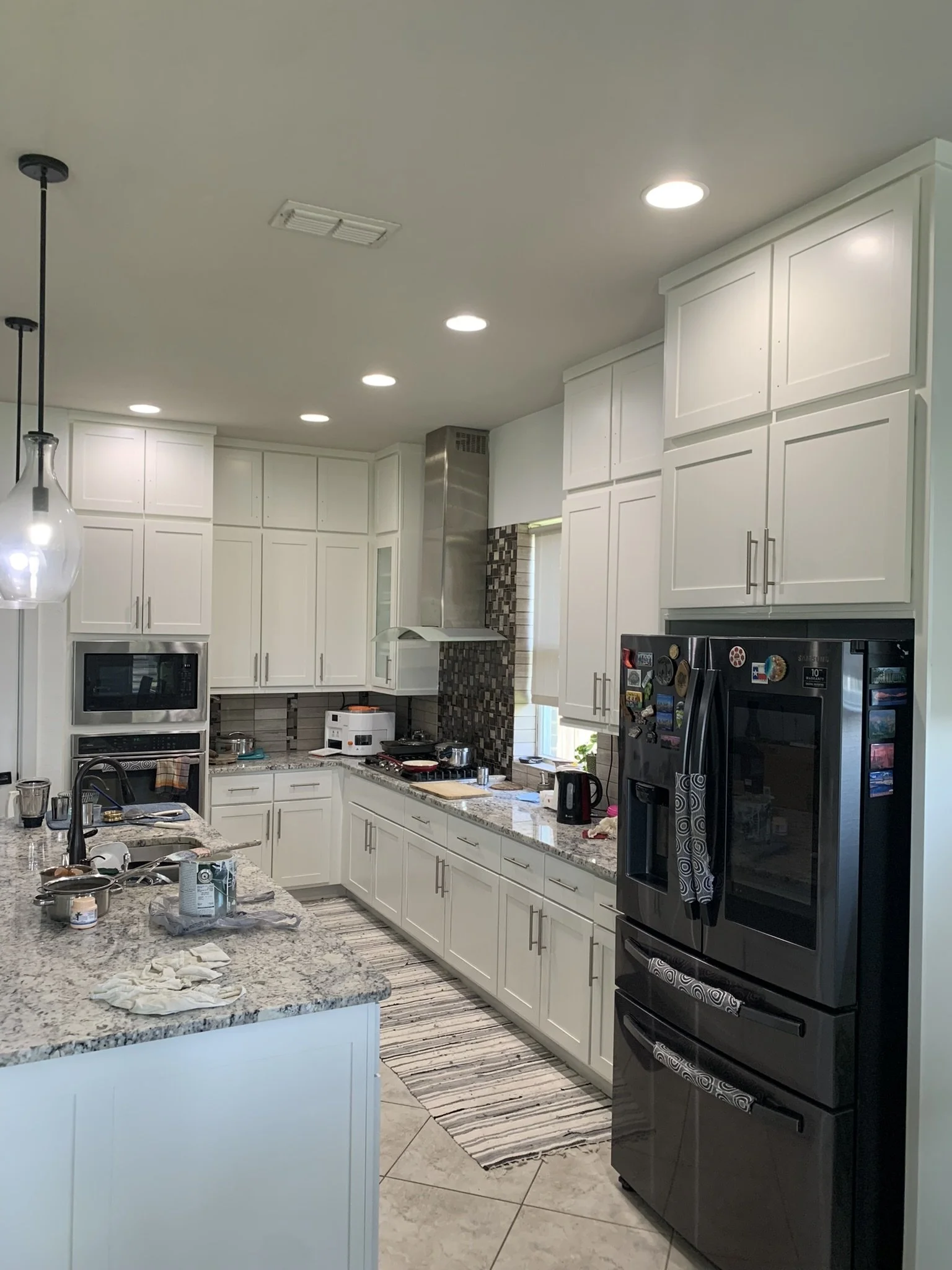 We built custom upper shaker cabinets to seamlessly blend into their existing kitchen cabinets. We finished the kitchen cabinets and island with a fresh coat of Sherwin Williams Alabaster.